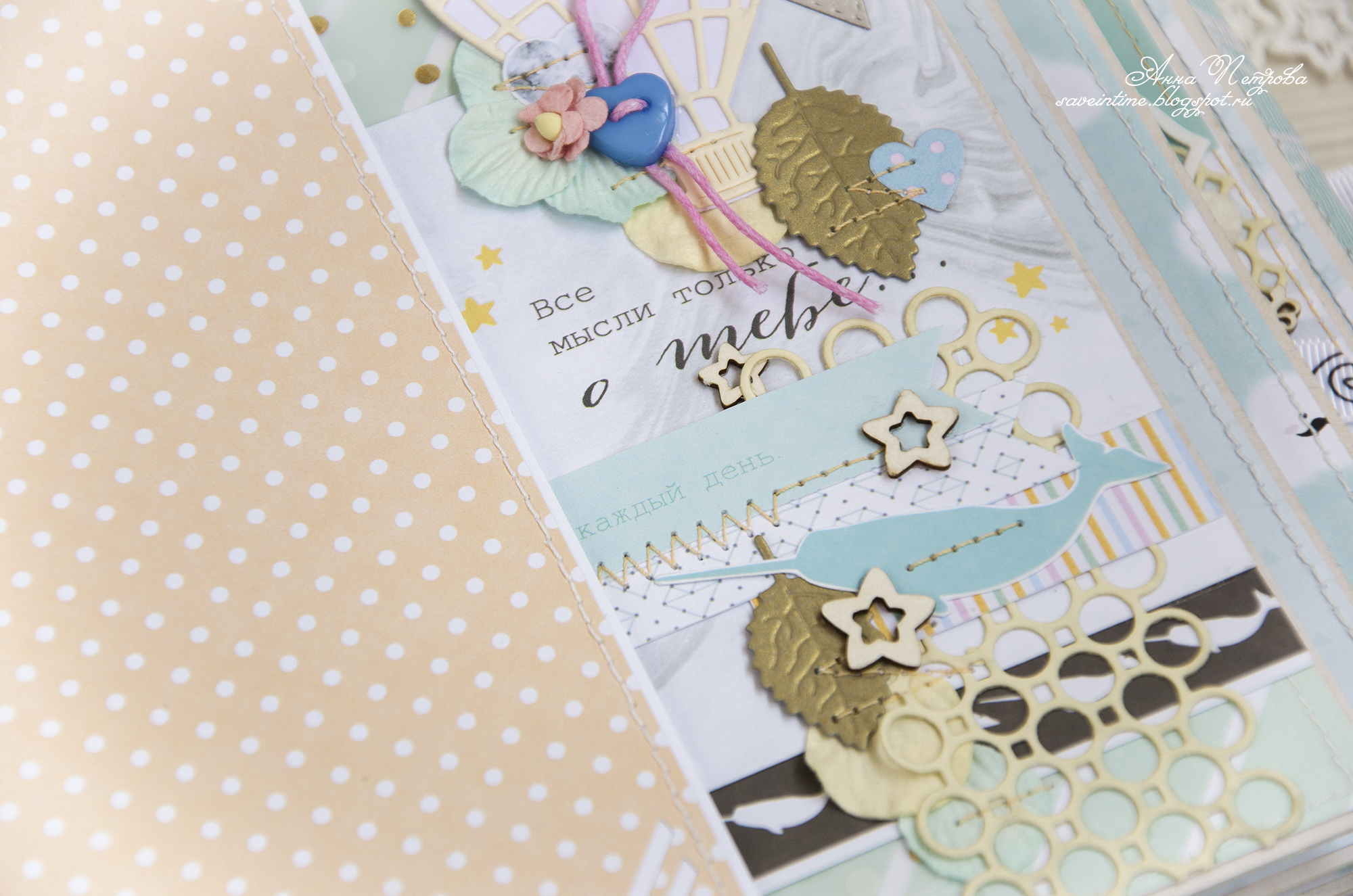Недавно звонила заказчица, сказала, что альбом очень понравился, чему я бесконечно рада, поскольку перерыв в скрапе был большой, и за дело я бралась с опасением, что ручки забыли все, а навык потерялся. Сначала было тяжело, потом втянулась :)) Но палитра у альбома получилась странная немного... Тут уже, правда, фотографии свое слово сказали, потому что ориентировалась на них. С фото смотрится лучше, как мне показалось.